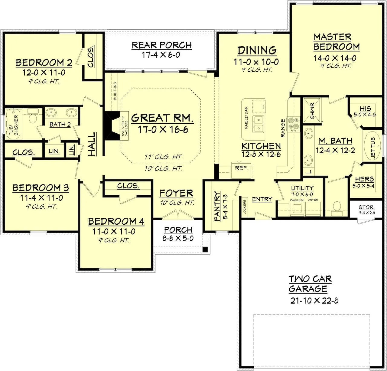 This inviting house plan offers a total living area of 1,798 square feet, providing a comfortable space for families. The spacious first floor features 1,798 square feet, perfect for everyday living and entertaining. With four bedrooms and two bathrooms, this layout is ideal for larger families. The total porch area of 145 square feet enhances outdoor living options, while the front-load garage accommodates two vehicles, adding convenience and storage. Built on a solid slab or crawl foundation with 2x4 wall framing, this home combines durability with modern style. The exterior features a classic brick finish, adding charm and character. Measuring 59 feet 2 inches in width and 56 feet 8 inches in depth, the house stands at a height of 22 feet 4 inches, with a first-floor ceiling height of 9 feet that creates an open and airy atmosphere. This house plan is a perfect blend of functionality, comfort, and style.