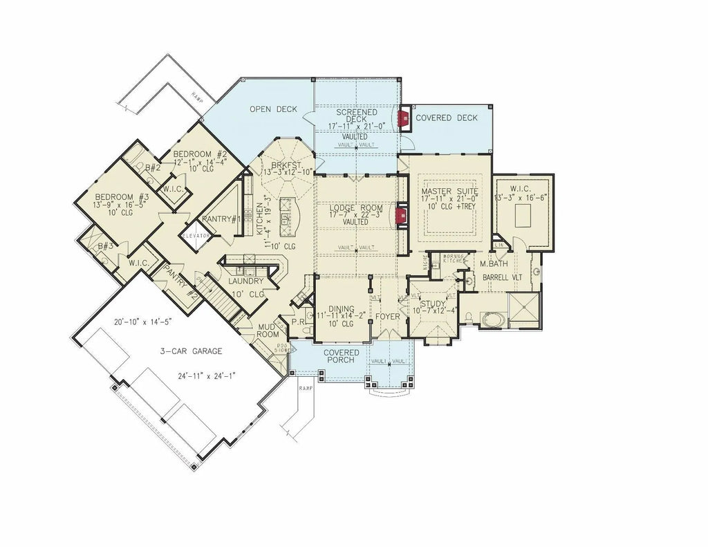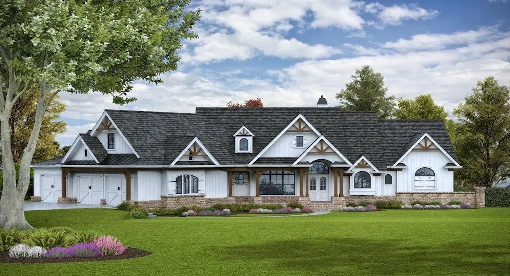 This striking house plan offers a total living area of 3,696 square feet, designed for comfort and functionality. The expansive first floor features 3,696 square feet, perfect for family gatherings and entertaining, while the substantial basement adds 2,913 square feet of versatile space, ideal for recreation, storage, or a home gym. With three well-appointed bedrooms and three bathrooms, plus one half bathroom, this home caters to family needs effortlessly. The side-load garage accommodates three vehicles, providing a total area of 947 square feet for parking and additional storage. Constructed on a solid basement foundation with 2x4 wall framing, this home combines durability with contemporary aesthetics. Measuring 106 feet 2 inches in width and 87 feet 4 inches in depth, the house stands at a height of 28 feet 5 inches. Both the first floor and basement feature a ceiling height of 10 feet, creating an open and airy atmosphere throughout. This house plan is an ideal blend of style, space, and practical living.
