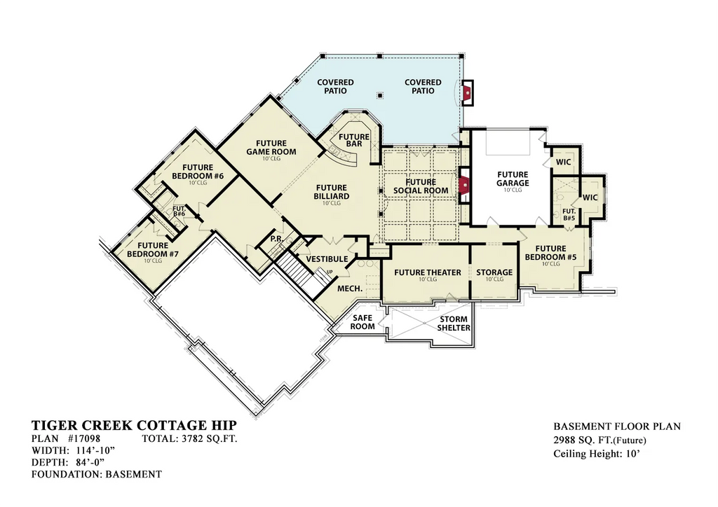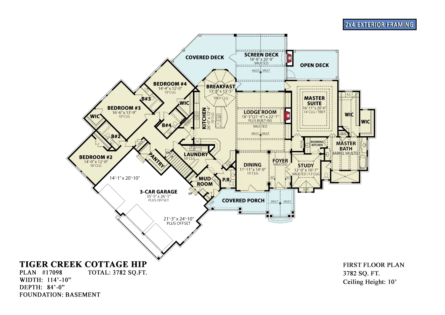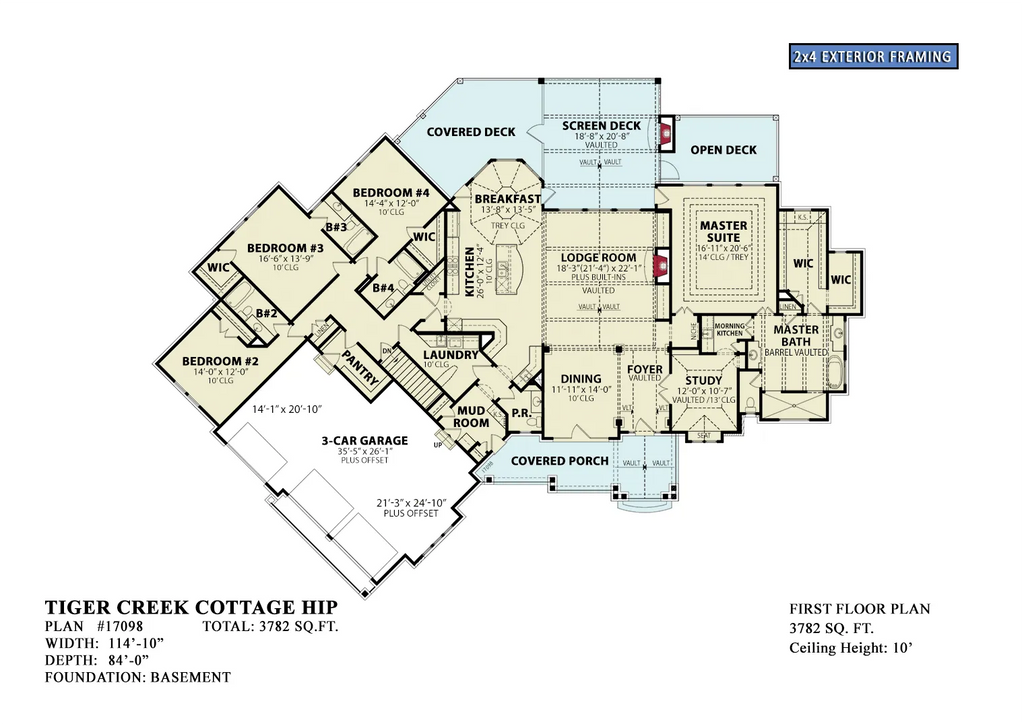 This stunning house plan features a total living area of 3,782 square feet, providing ample space for comfortable and stylish living. The expansive first floor offers 3,782 square feet, perfect for entertaining and family gatherings, while the spacious basement adds another 2,988 square feet, ideal for recreation, storage, or future expansion. With four well-appointed bedrooms and four bathrooms, plus one half bathroom, this home is perfect for families. The side-load garage accommodates three vehicles, with a total area of 858 square feet, offering practical storage solutions. Built on a solid basement foundation with 2x4 wall framing and an attractive brick exterior, this home combines durability with classic elegance. Measuring 114 feet 10 inches in width and 84 feet in depth, the house stands at a height of 28 feet 5 inches. Both the first floor and basement feature a ceiling height of 10 feet, creating an open and inviting atmosphere throughout. This house plan is a perfect blend of luxury, functionality, and modern design.