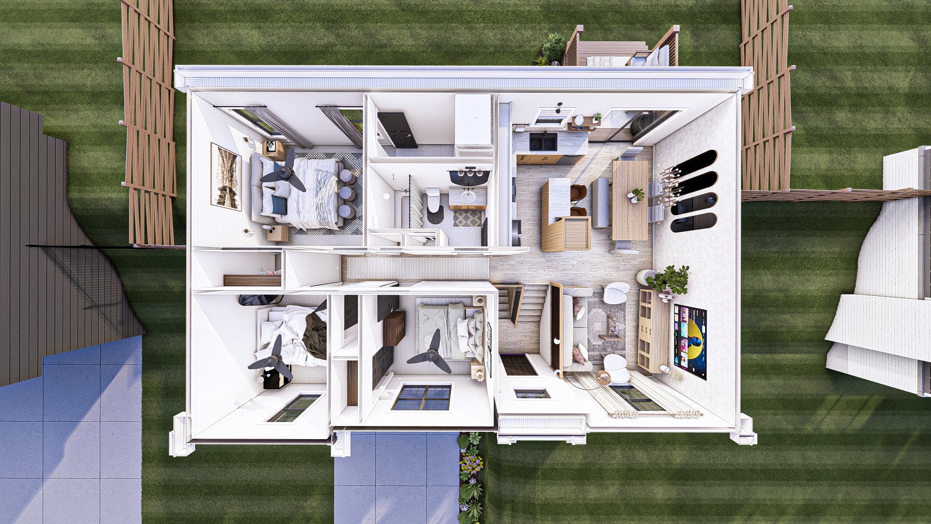 The first-floor master suite offers privacy and comfort, making this plan especially appealing for homeowners who prefer main-level living. The suite includes a walk-in closet and a private master bathroom, creating a quiet retreat away from the home’s shared spaces. Two additional bedrooms are efficiently arranged to share a second full bathroom, making the layout well-suited for families, guests, or flexible use as a home office or hobby room.