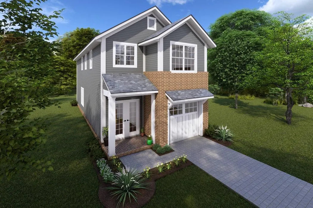 This charming house plan offers a total living area of 1,567 square feet, thoughtfully designed for comfortable living. The first floor features 661 square feet, perfect for daily activities, while the second floor adds another 906 square feet, ideal for bedrooms and additional living space. A cozy front porch of 36 square feet provides a welcoming entrance. The front-load garage accommodates one vehicle, with a total area of 245 square feet, offering practical storage solutions. Built on a sturdy slab foundation with 2x4 wall framing and stick roof framing, this home combines durability with style. With dimensions of 19 feet in width and 50 feet in depth, the house stands at a height of 24 feet 10 inches. The roof pitch of 8:12 adds an attractive architectural detail, while the layout includes three bedrooms and two full bathrooms plus one half bath, making it suitable for families or those needing extra space. This house plan is a perfect blend of modern design and functionality.