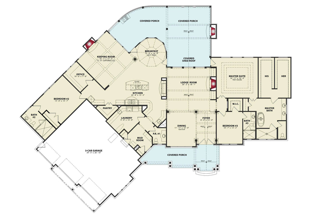This stunning house plan offers a generous total living area of 3,432 square feet, all on the first floor, ensuring easy accessibility and flow. The layout features three spacious bedrooms and three well-appointed bathrooms, making it perfect for families. Enjoy outdoor living with a charming front porch of 283 square feet and a large rear porch of 762 square feet, ideal for relaxation and entertaining. The front-load garage accommodates three vehicles, with a total area of 979 square feet, providing ample storage space. Built on a sturdy slab foundation with 2x4 wall framing and attractive stone exterior siding, this home combines durability with style. With overall dimensions of 111 feet 5 inches in width and 84 feet 7 inches in depth, the house reaches a height of 30 feet 3 inches. The first-floor ceiling height of 10 feet 1 inch enhances the open and airy feel throughout. This house plan beautifully blends modern design and functionality, making it an excellent choice for today’s homeowners.