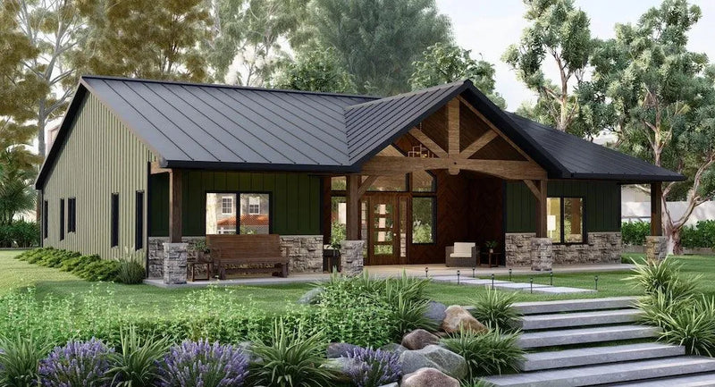 This thoughtfully crafted house plan features a generous total living area of 2,030 square feet, all located on the first floor for convenient living. With three comfortable bedrooms and two well-appointed bathrooms, this home is ideal for families or those who enjoy hosting guests. A stunning total porch area of 939 square feet invites outdoor relaxation and entertainment, enhancing the home's appeal. The front-load garage accommodates two vehicles, offering a total of 1,116 square feet of space, perfect for additional storage or workshop needs. Built on a durable slab foundation with 2x6 wall framing and truss roof framing, this house ensures both strength and style. The dimensions of the home are 81 feet in width and 64 feet in depth, standing at a height of 18 feet 11 inches. With a ceiling height of 9 feet throughout the first floor, the interior feels spacious and inviting. This house plan beautifully combines modern design with functional features, making it an excellent choice for today’s homeowners.