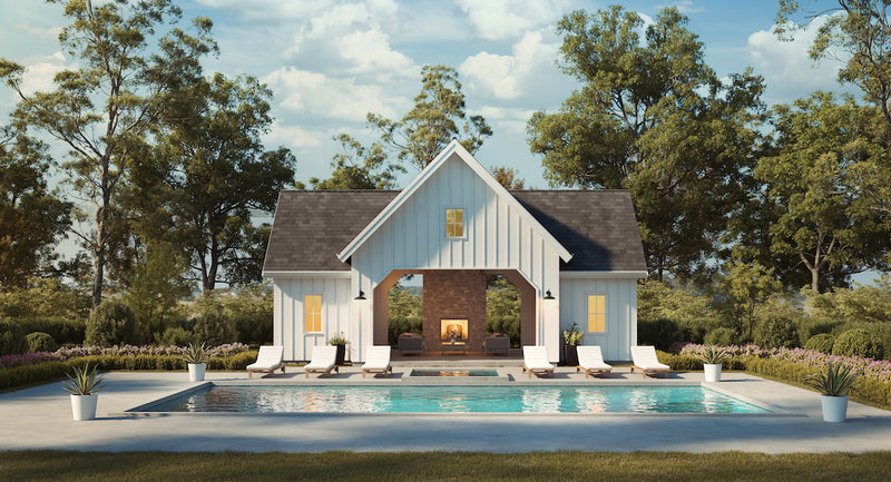 This 242 sq ft pool house features a slab foundation, 2x6 wall framing, and truss roof framing. The design includes a cozy 1st floor with a half bathroom and high 9' ceilings. Key highlights include a fireplace, an outdoor fireplace for entertaining, and a wet bar for added luxury. The home’s width is 36' and depth is 20'6", offering efficient use of space for modern living.