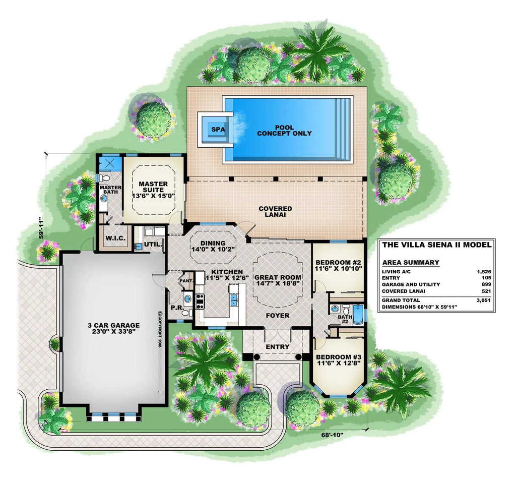 This beautifully designed home plan features a total living area of 1,526 sq ft. The first floor offers an expansive layout, perfect for comfortable living and entertaining. With three inviting bedrooms, two full bathrooms, and a convenient half bathroom, this home caters to families and guests alike. The stunning lanai, spanning 521 sq ft, provides a perfect outdoor retreat for relaxation and gatherings.