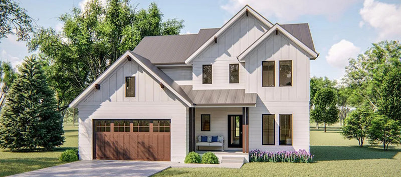 Enjoy the charm of a 54 sq ft front porch, perfect for relaxing with a morning coffee or greeting neighbors. The front-loading garage accommodates two vehicles and offers convenient storage solutions. Built on a solid basement foundation with durable 2x4 wall framing, this home features a stylish roof pitch of 8:12 and 10:12, enhancing its architectural appeal. With dimensions of 44' in width and 36' in depth, and a building height of 29', this residence makes a welcoming statement. High ceilings of 9' on the first floor and 8' on the second create an airy and spacious atmosphere throughout. This house plan combines functionality, style, and comfort, making it the perfect choice for your next home.