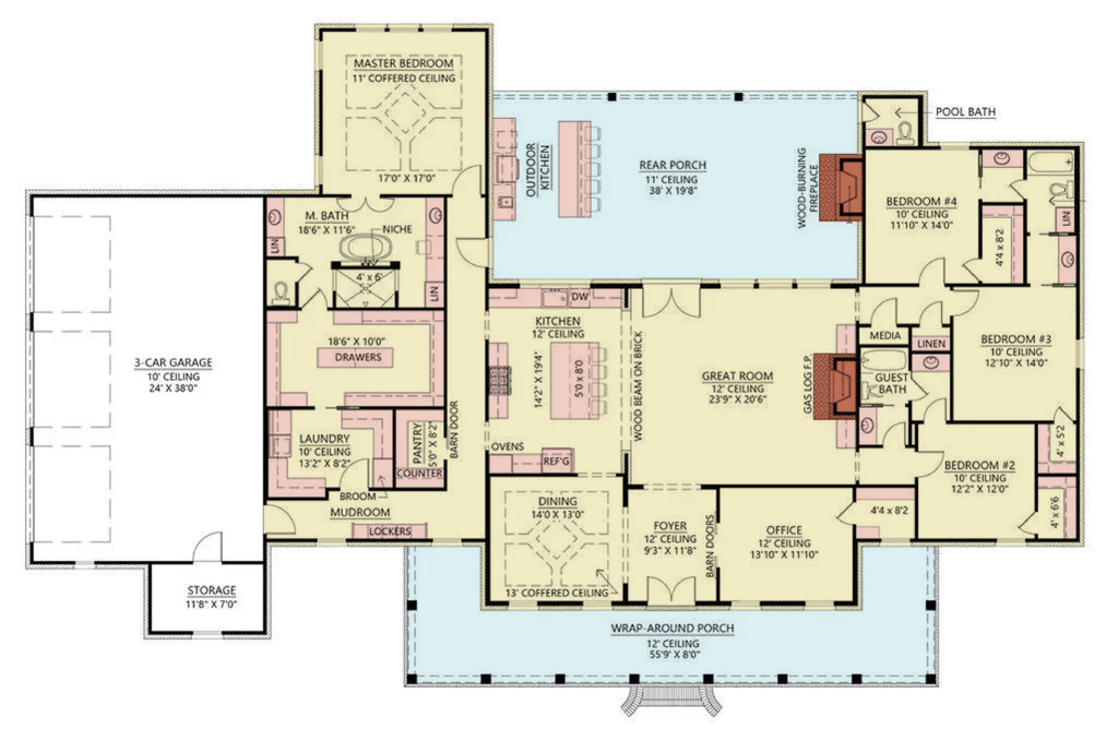 Take a step into your dream residence! This beautifully designed house plan offers a remarkable total living area of 3,535 sq ft on the first floor, making it ideal for families seeking both comfort and space. With four generously sized bedrooms, three full bathrooms, and an additional half bathroom, this home provides the perfect blend of privacy and convenience. The open-concept layout seamlessly integrates living, dining, and kitchen areas, creating an inviting space for entertaining and everyday family life.