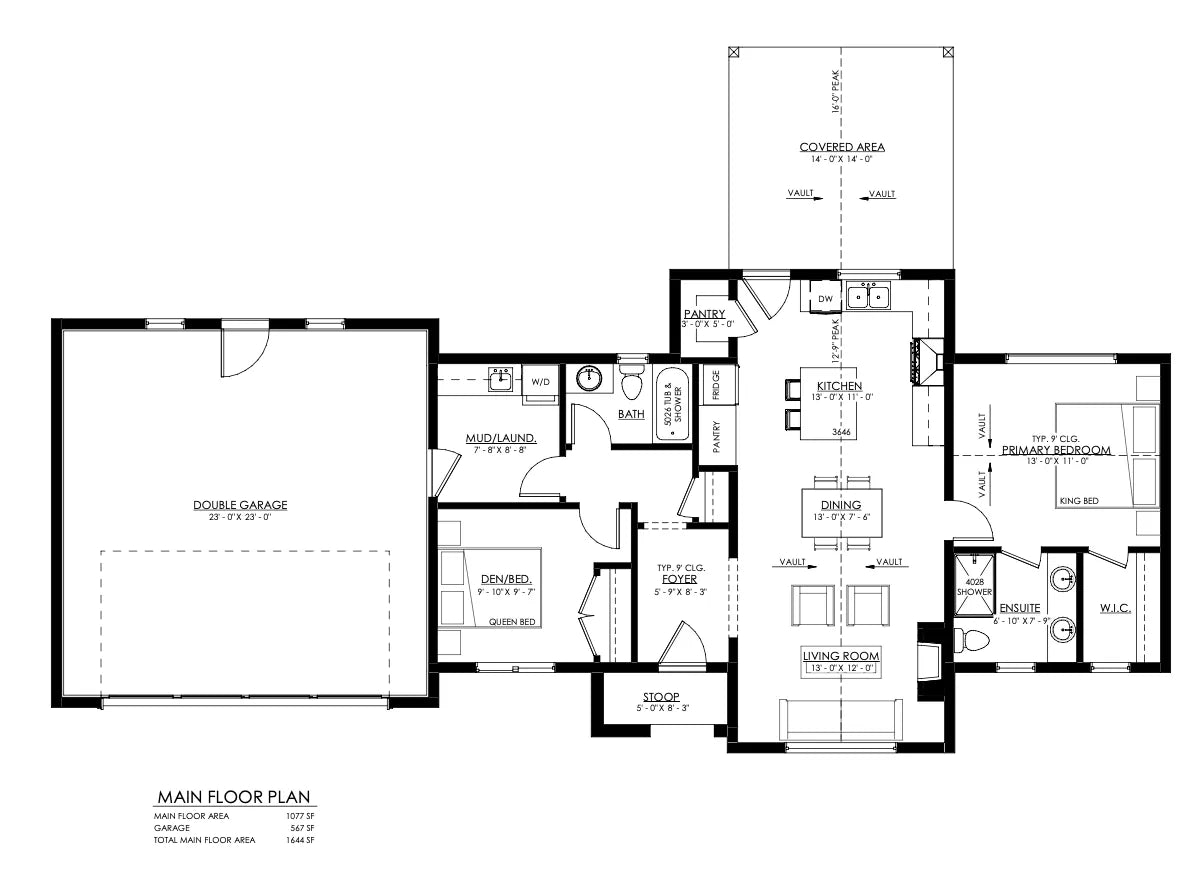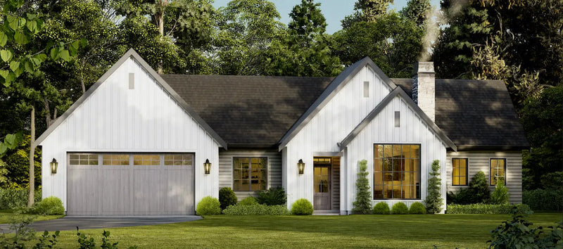 This beautifully designed 1,077 sq ft cottage-style home offers a warm and functional layout perfect for small families, downsizers, or vacation living. With 2 bedrooms and 2 full bathrooms all on the first floor, the plan emphasizes easy, single-level living with modern conveniences like a spacious mudroom, laundry room, and a luxurious first-floor master suite. The highlight is the grand two-story living area with vaulted ceilings, bringing in abundant natural light and a sense of spaciousness far beyond its square footage.