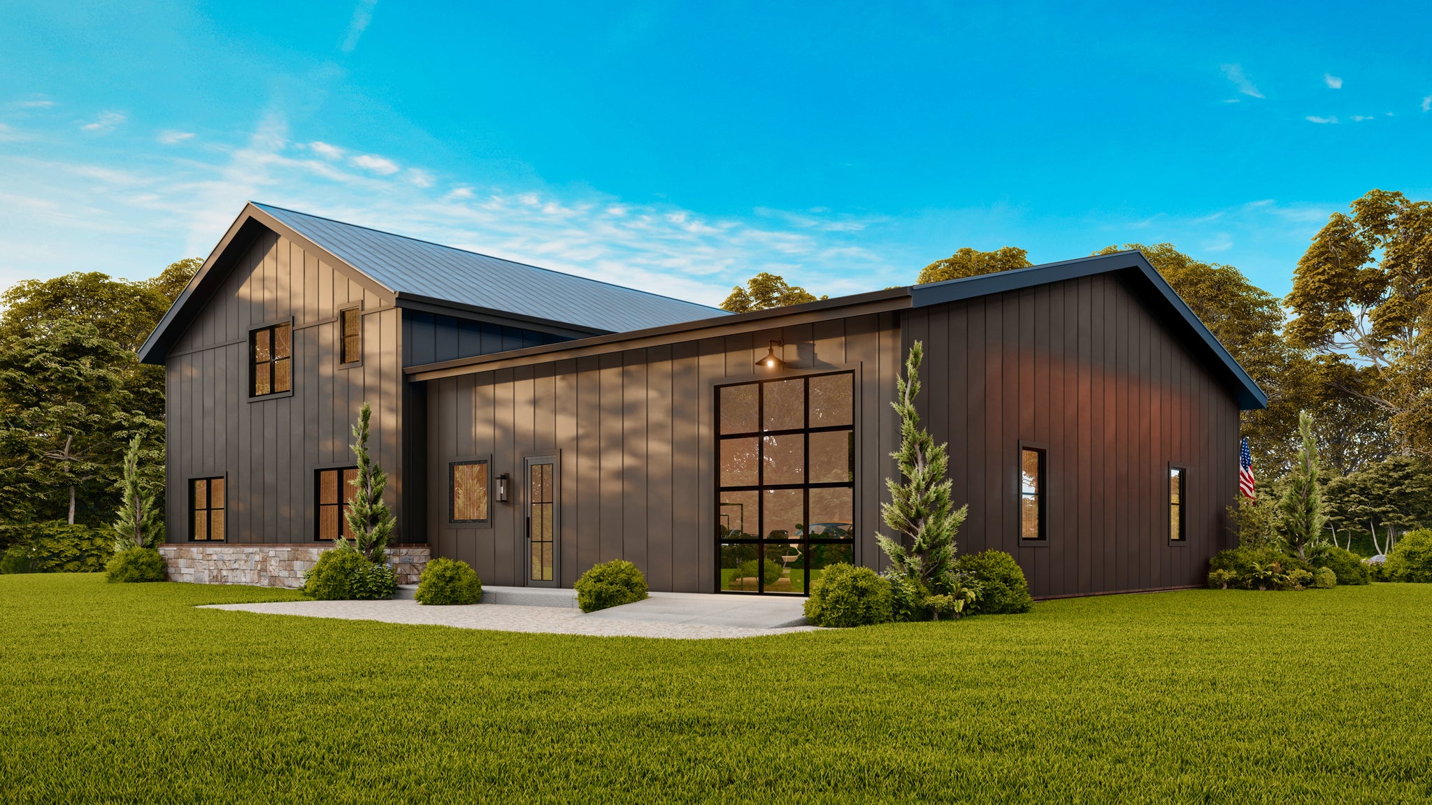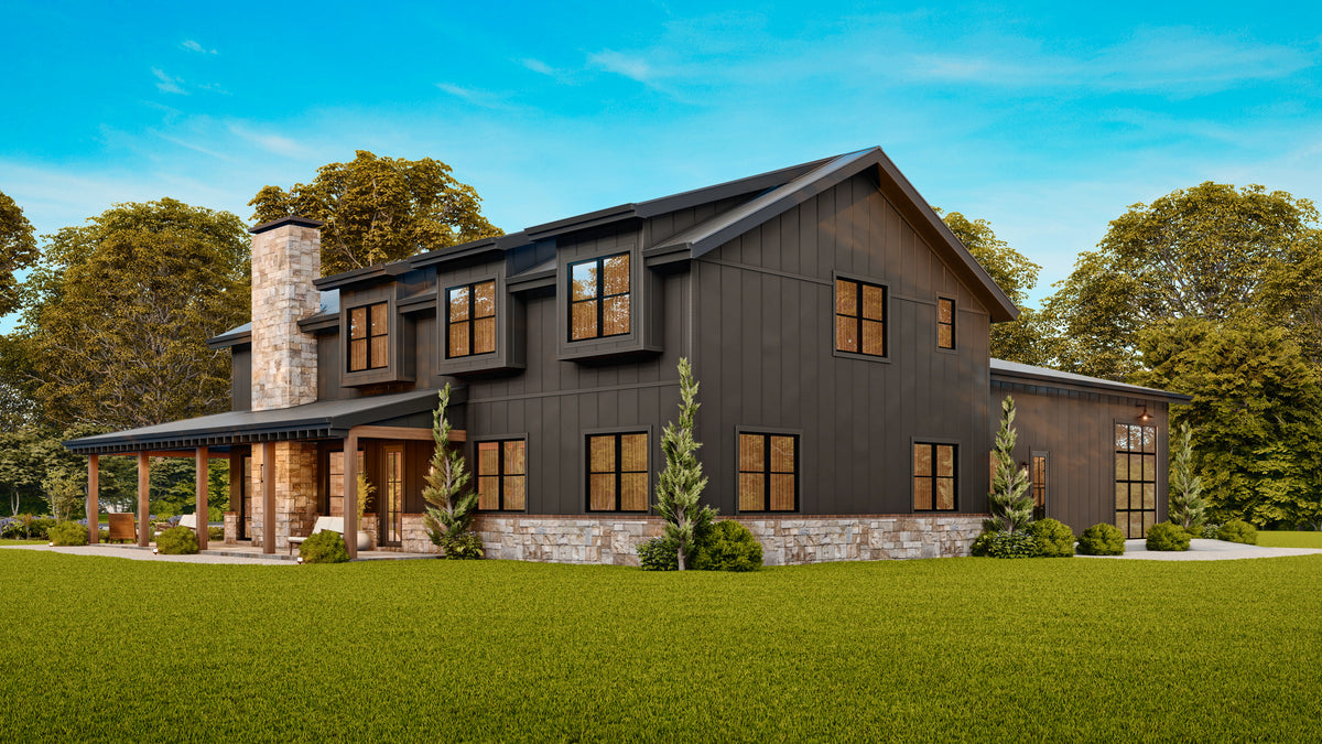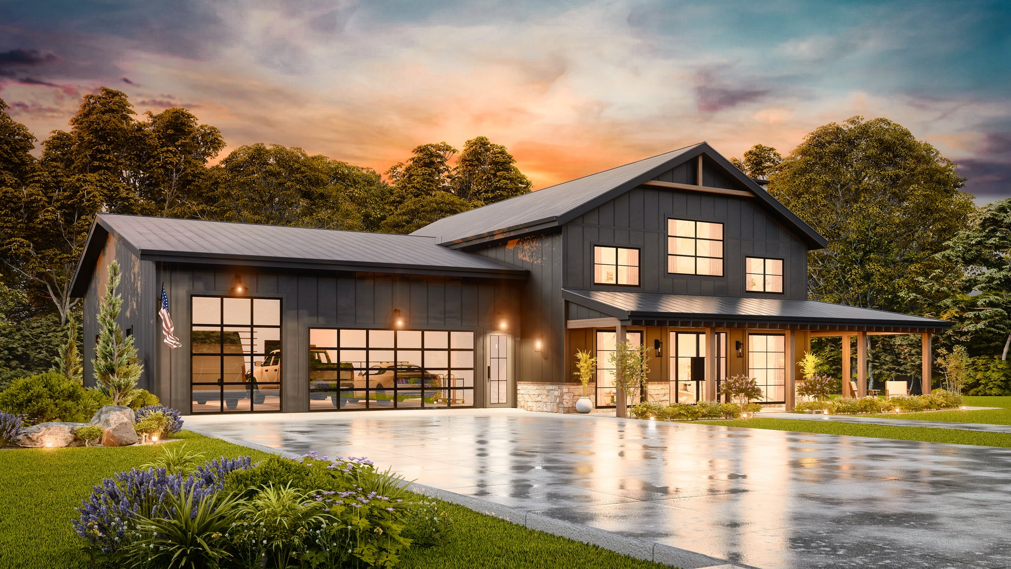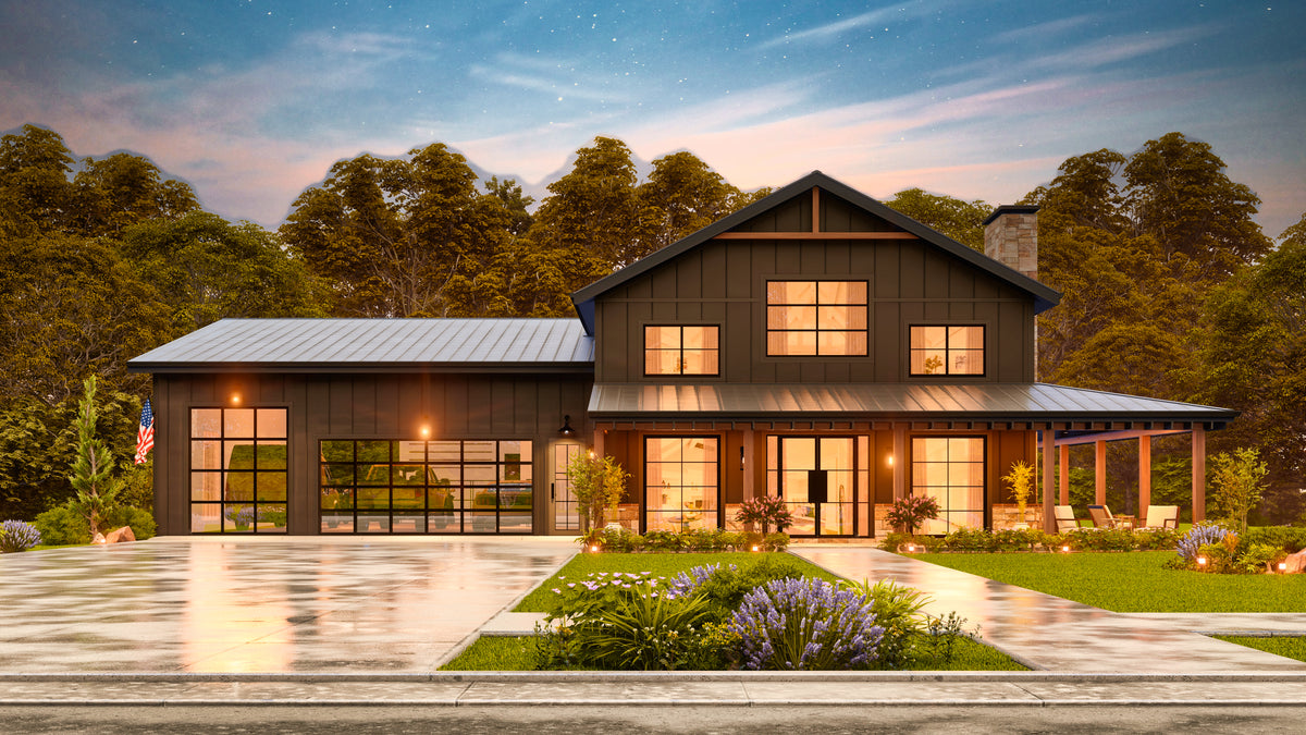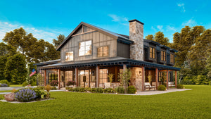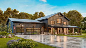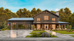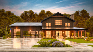 Whistlewood House Plan is a stunning example of Modern Farmhouse architecture. It features a white board-and-batten exterior with black-framed, floor-to-ceiling windows that provide a striking contrast and enhance the sleek, modern look. The metal roof adds to the modern aesthetic, while the wrap-around porch with wooden columns offers a touch of traditional farmhouse charm.