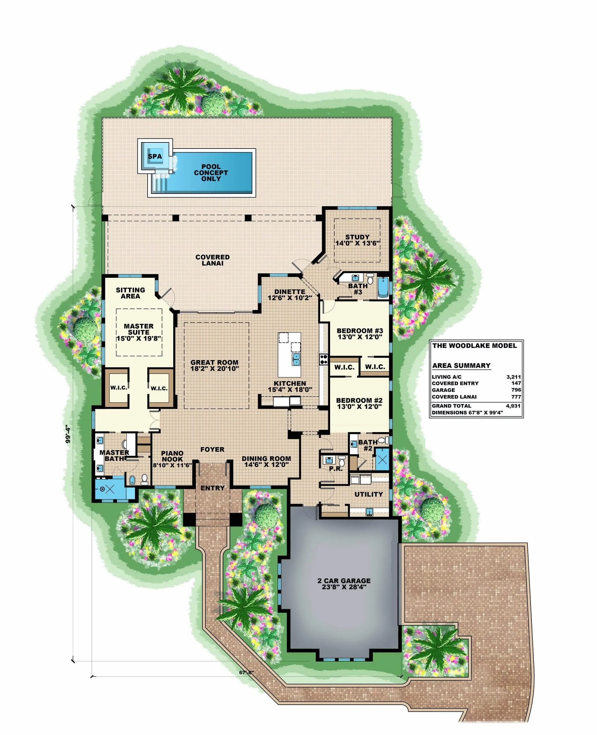 This thoughtfully designed house plan encompasses a total heated living area of 3,211 square feet, all located on the first floor, ensuring convenience and accessibility. The layout includes a welcoming lanai of 777 square feet, perfect for outdoor gatherings, along with a charming front porch measuring 147 square feet. The garage is practical at 796 square feet, featuring two bays and a side load for easy access. Inside, the home boasts three bedrooms, three bathrooms, and one half bathroom, making it suitable for families or guests.